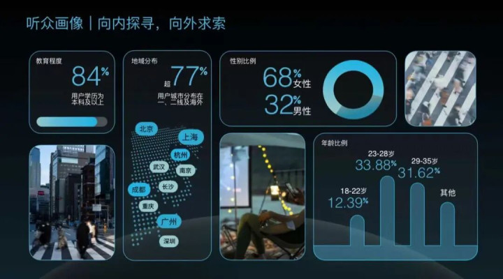 数据显示,平台用户整体呈现出高学历、高线城市集中特征:84%的用户学历为本科及以上,77%的用户分布在一、二城市及海外市场。23-35岁用户合计占比超过65%,其中23-28岁用户占比33.88%,29-35岁占比31.62%。